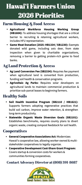 National Farmers Union (NFU) Policy (View) Hawai'i Farmers Union (HFU) Bylaws (Download) HFU Notice of the 2025 Annual Meeting (View) HFU Policy Priorities 2026 (View) HFU Policy Statement 2026 (View)